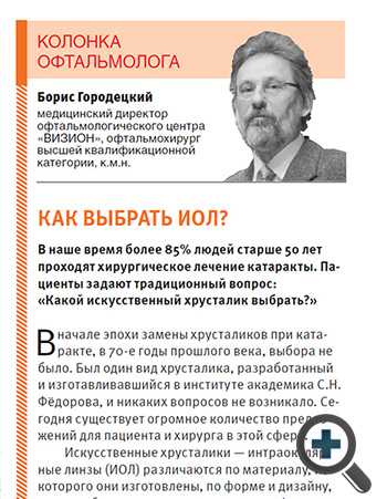 В очередных сентябрьском и ноябрьском выпусках газеты "50 плюс.Все плюсы зрелого возраста "Медицинский директор офтальмологического центра "ВИЗИОН" Борис Карлович Городецкий обращается к теме вирусных заболеваний глаз – их особенностях, лечении и профилактике и важному вопросу выбора при хирургическом лечении катаракты – выбора искусственного хрусталика – интраокулярной линзы (ИОЛ).