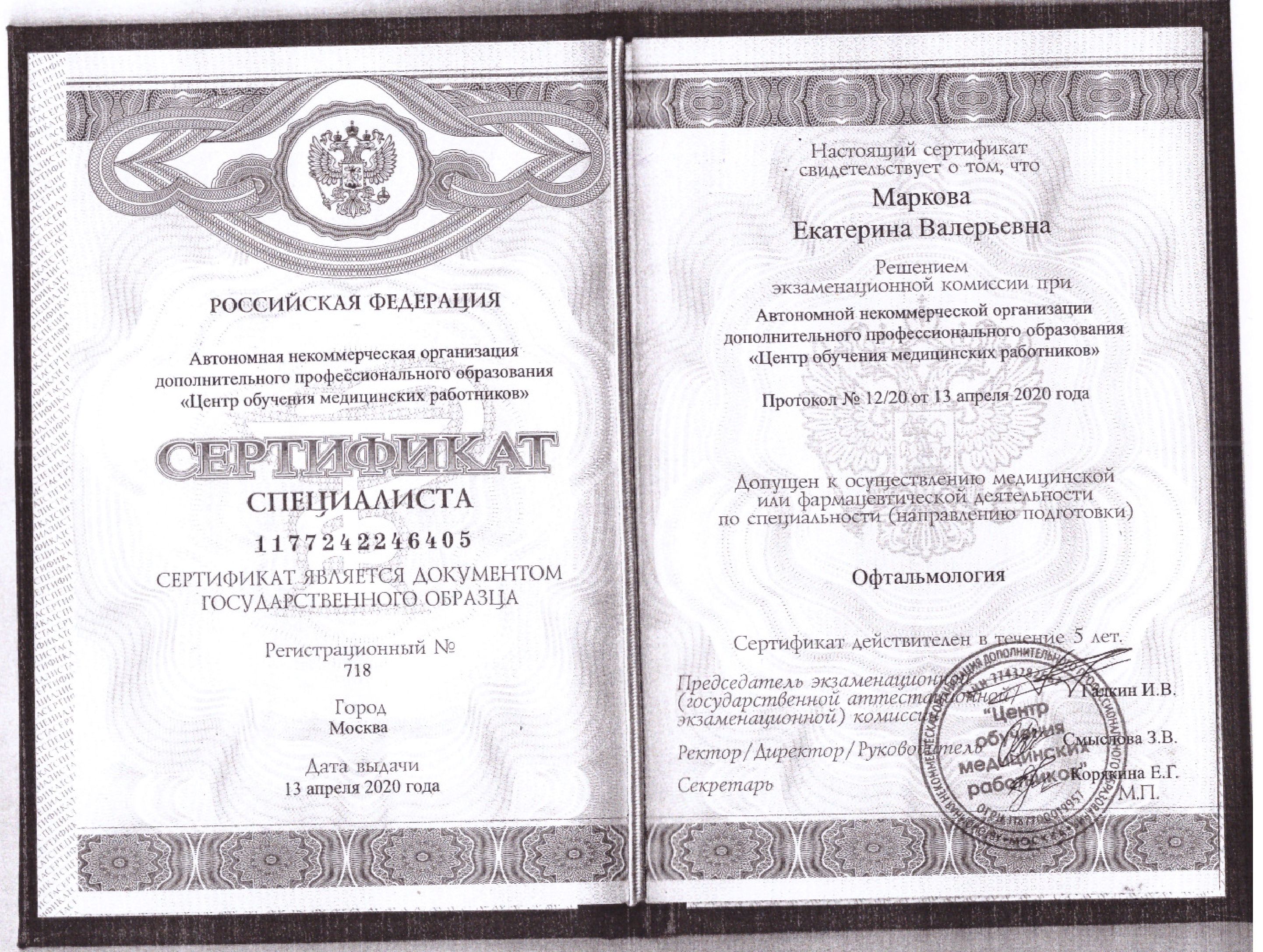 В 2010 г. окончила ординатуру по специальности «Офтальмология» на базе Российского государственного медицинского университета.